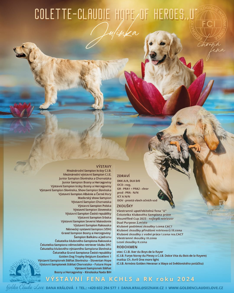 Jsi výstavní šampion krásy 13 zemí, stala ses Výstavní fenkou v soutěži Klubu chovatelů loveckých slídičů a Výstavní fenkou v soutěži Retriever Klubu CZ, získala jsi také 2. místo DUAL PURPOSE fena Golden retriever a přišla ti krásná pošta z Belgie - oficiálně ses stala Mezinárodním šampionem (C.I.B.) a Mezinárodním výstavním šampionem (C.I.E.)